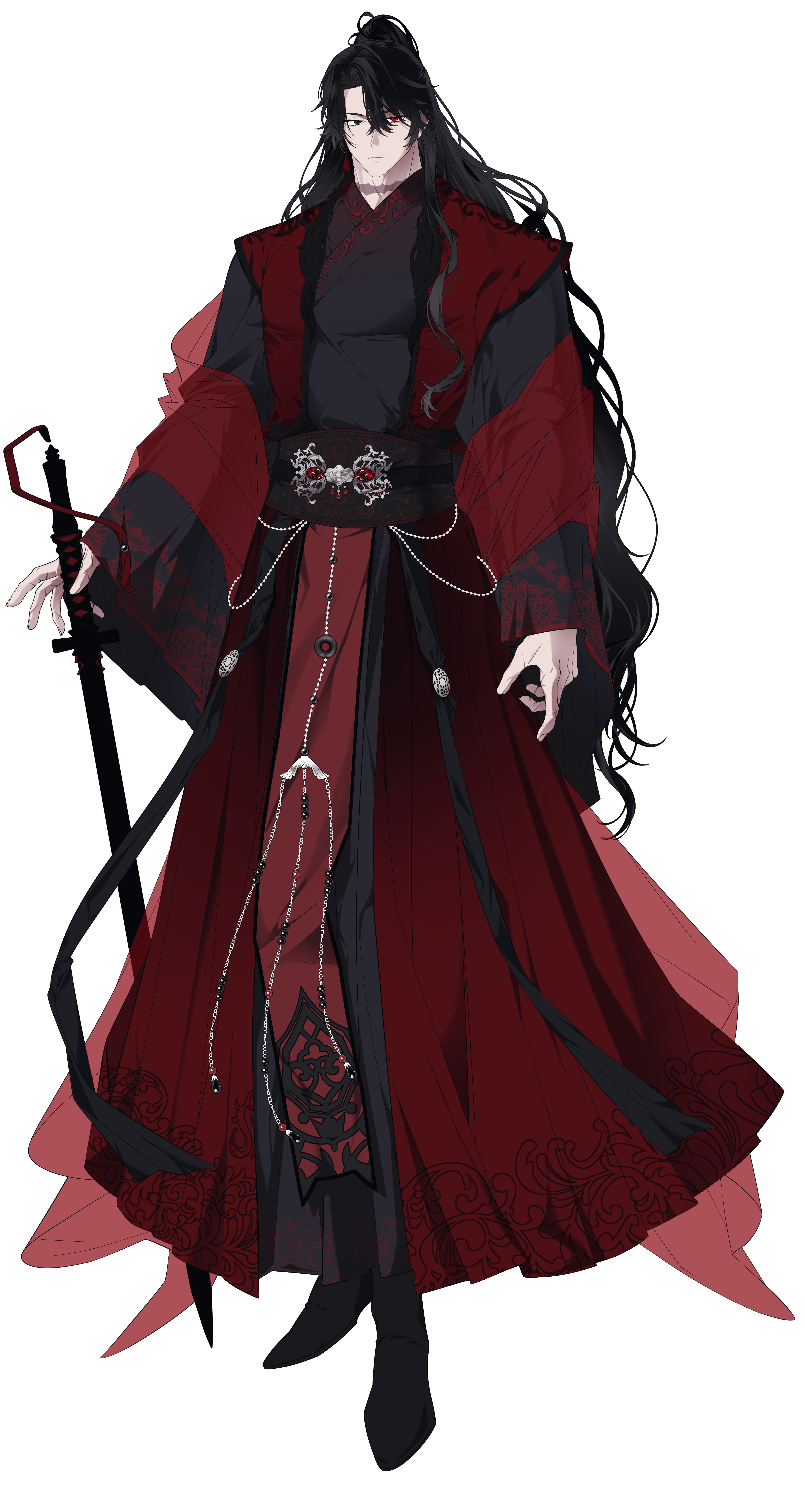 화려한 검은색/붉은색 비단옷, 검신이 까만 장검 패용